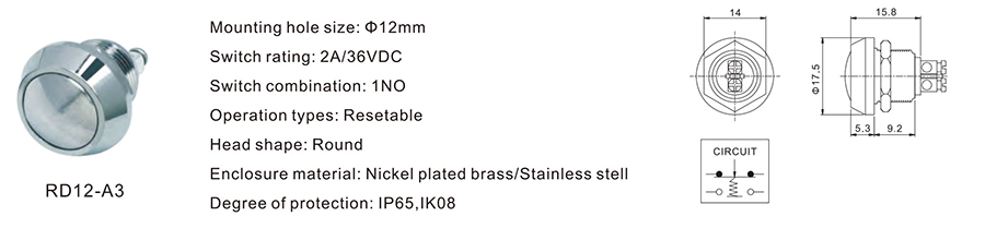 12MM金屬開關(guān)RD12-D4 金屬開關(guān) RD12-D4 36VDC 2A / / ≥100,000 CYCLES 立即申請(qǐng) 下載