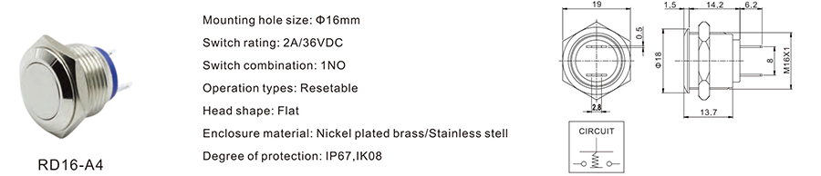 金屬開關 | RD16-D4 | 36VDC | 2A | / | / | ≥100,000 CYCLES | 立即申請 | 下載 |