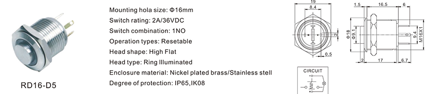 16MM金屬開(kāi)關(guān)RD16-D5 金屬開(kāi)關(guān) RD16-D5 36VDC 2A / / ≥100,000 CYCLES 立即申請(qǐng) 下載