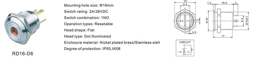 金屬開關(guān) | RD16-D4 | 36VDC | 2A | / | / | ≥100,000 CYCLES | 立即申請 | 下載 |
