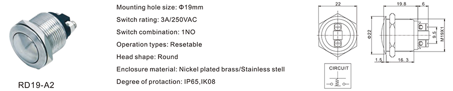 19MM金屬開關(guān)RD19-A2 金屬開關(guān) RD19-A2 250VDC 3A / / ≥100,000 CYCLES 立即申請 下載
