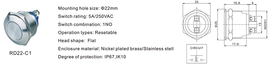 22MM金屬開關(guān)RD22-F1 金屬開關(guān) RD22-F1 250VDC 5A / / ≥100,000 CYCLES 立即申請 下載