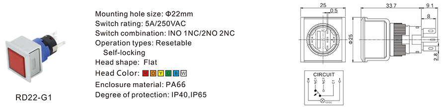 22MM金屬開關(guān)RD22-G1 金屬開關(guān) RD22-G1 250VDC 5A / / ≥100,000 CYCLES 立即申請 下載
