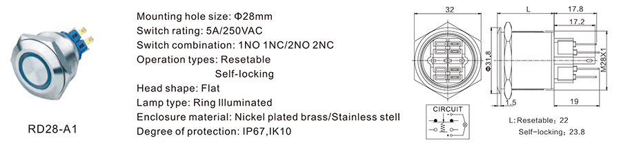金屬開關(guān) | RD28-A3 | 250VDC | 5A | / | / | ≥100,000 CYCLES | 立即申請(qǐng) | 下載 |