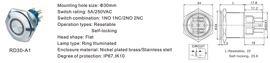 金屬開關(guān) | RD30-A1 | 250VDC | 5A | / | / | ≥100,000 CYCLES | 立即申請 | 下載 |