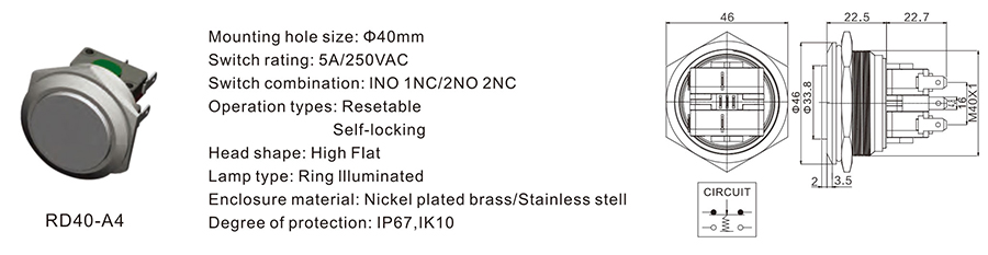 40MM金屬開關(guān)RD40-A4 金屬開關(guān) RD40-A4 250VDC 5A / / ≥100,000 CYCLES 立即申請 下載