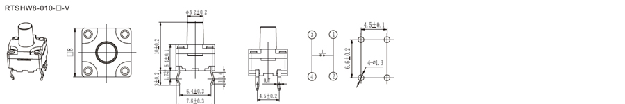 8x8mm輕觸開關 | RTSHW8 | 12VDC | 50mA | 2+1gf | 0.5±0.3mm | 1,000,000 cycles | 立即申請 | 下載 |
