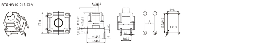 10x10mm輕觸開關(guān) | RTSHW10 | 12VDC | 50mA | 2+1gf | 0.5±0.3mm | 1,000,000 cycles | 立即申請(qǐng) | 下載 |