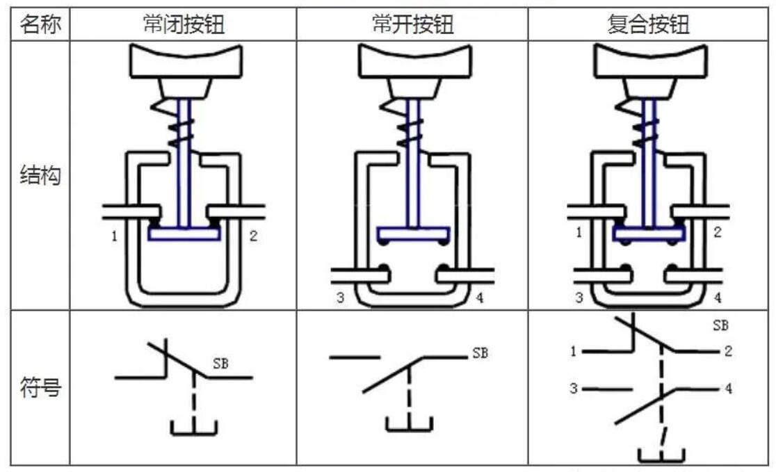 圖1所示的是一種按鈕的外形與剖面圖。按鈕的符號(hào)如表1所示。對(duì)于復(fù)合按鈕,將按鈕帽按下時(shí),下面一對(duì)原來(lái)斷開(kāi)的靜觸點(diǎn)被動(dòng)觸點(diǎn)接通,以接通某一控制電路;而上面一對(duì)靜觸點(diǎn)則被斷開(kāi),以斷開(kāi)另一控制電路??梢院?jiǎn)單總結(jié)起動(dòng)作過(guò)程:按下先斷“1”“2”后合“3”“4”,松開(kāi)先斷“3”“4”后合“1”“2”。